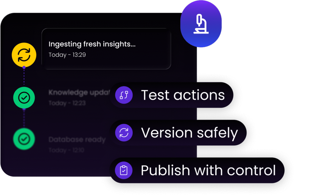 Test and compare actions against curated golden sets and real workflows. Track accuracy, latency, and cost; roll back instantly; and publish safely with approvals, shadow runs, and canary rollouts — so your AI stays predictable and trustworthy in production.