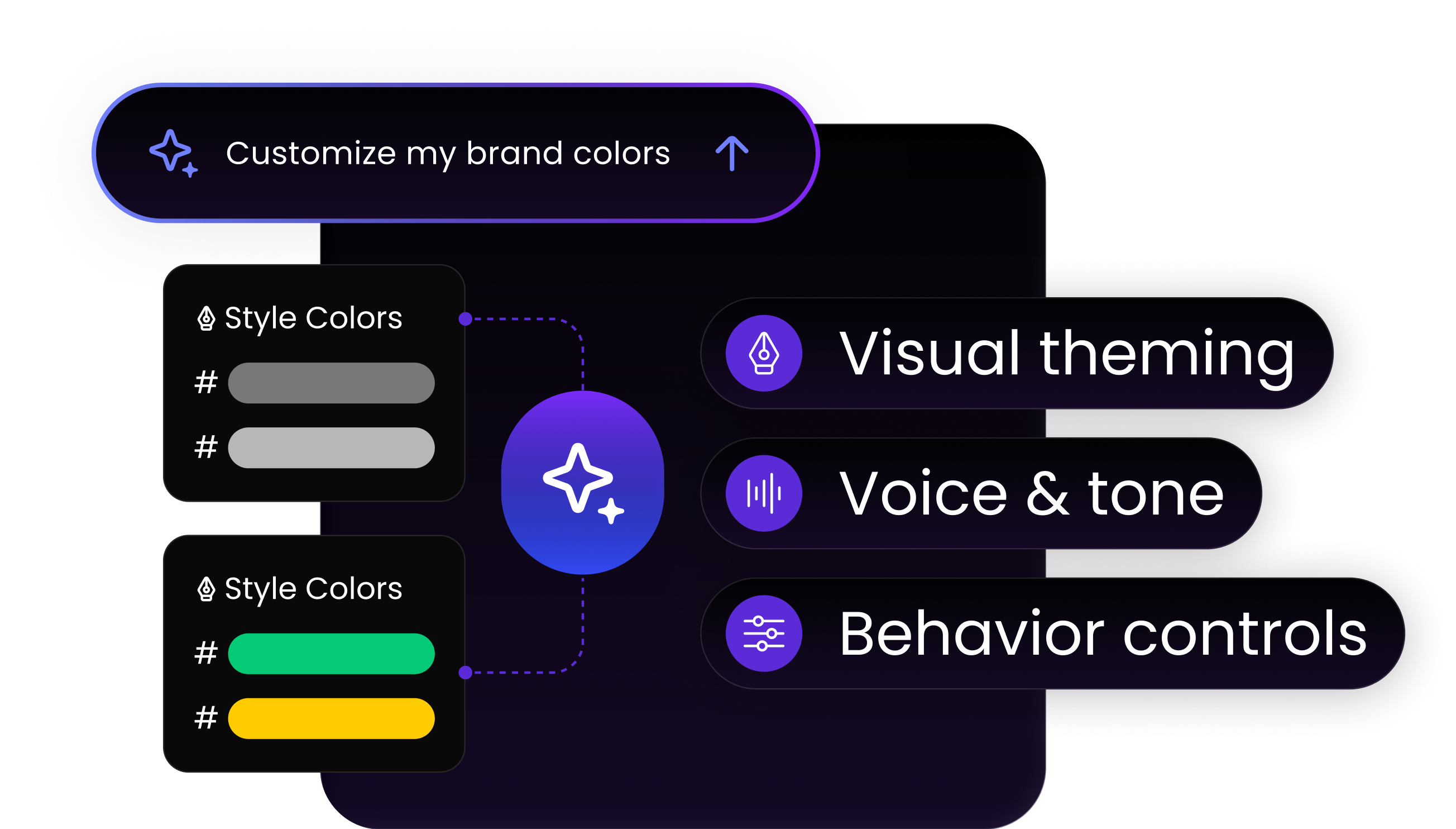 Match your product’s look and feel with configurable colors, typography, spacing, and placement. Set persona, tone, and terminology to fit your industry. Tune behavior with guardrails, escalation paths, and environment-specific overrides so the agent acts appropriately for every role, tenant, and plan.